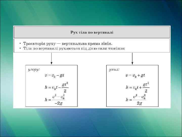 Закріплення нових знань і вмінь • Від яких величин залежить значення прискорення вільного падіння? • Чому значення прискорення вільного падіння різне на різних широтах Землі? • Охарактеризуйте рух тіла по вертикалі вгору та вниз. • Якими формулами описується рух тіла, кинутого вертикально вгору? • Якими формулами описується рух тіла, що падає по вертикалі вниз?