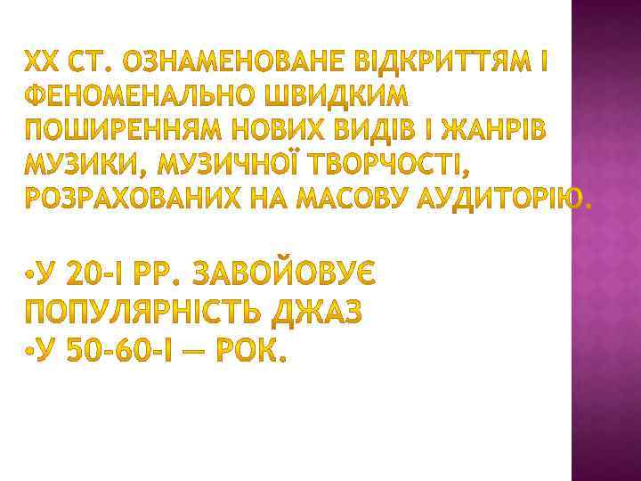 Поп-Музика Поп-му зика — поняття, що охоплює різноманітні стилі, жанри та напрями масового музикування. Фено мен поп-музики сформувався передусім в англомовних країнах Заходу як явище молодіжної культури.