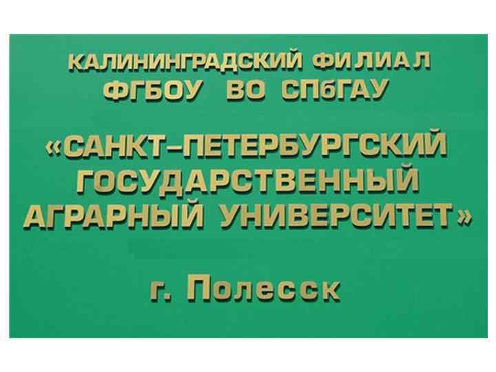 Калининградский филиал СПб. ГАУ был основан 29. 12. 1959 г. решением Совета Министров СССР постановление № 8 в виде Учебно-консультационного пункта Ленинградского сельскохозяйственного института, который в 1961 г. был преобразован в Калининградский филиал Ленинградского сельскохозяйственного института. Было открыто обучение по заочной форме по следующим специальностям: механизация с/х, агрономия, зоотехния, экономика и бухгалтерский учет. На основании Приказа Министра сельского хозяйства РФ № 402 от 14. 08. 1992 года Калининградский филиал Ленинградского сельскохозяйственного института переименован в Калининградский филиал Санкт. Петербургского государственного аграрного университета.