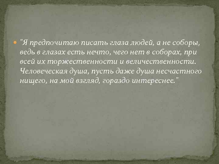 "Я предпочитаю писать глаза людей, а не соборы, ведь в глазах есть нечто, чего нет в соборах, при всей их торжественности и величественности. Человеческая душа, пусть даже душа несчастного нищего, на мой взгляд, гораздо интереснее. "