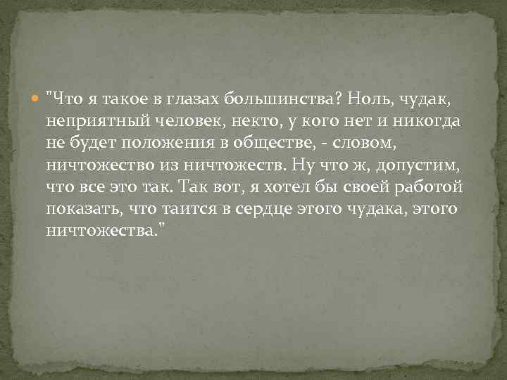"Что я такое в глазах большинства? Ноль, чудак, неприятный человек, некто, у кого нет и никогда не будет положения в обществе, - словом, ничтожество из ничтожеств. Ну что ж, допустим, что все это так. Так вот, я хотел бы своей работой показать, что таится в сердце этого чудака, этого ничтожества. "