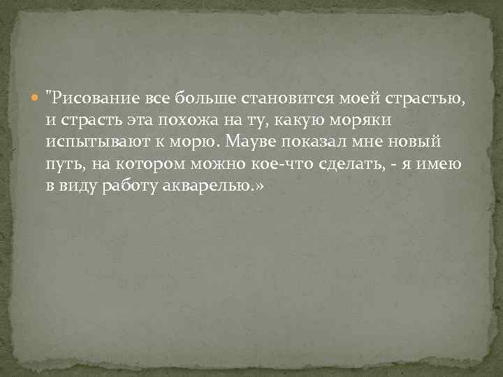 "Рисование все больше становится моей страстью, и страсть эта похожа на ту, какую моряки испытывают к морю. Мауве показал мне новый путь, на котором можно кое-что сделать, - я имею в виду работу акварелью. »
