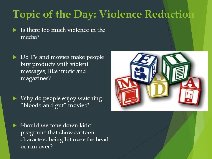 Topic of the Day: Violence Reduction Is there too much violence in the media? Do TV and movies make people buy products with violent messages, like music and magazines? Why do people enjoy watching “bloods-and-gut” movies? Should we tone down kids’ programs that show cartoon characters being hit over the head or run over?