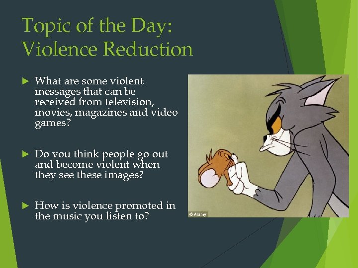 Topic of the Day: Violence Reduction What are some violent messages that can be received from television, movies, magazines and video games? Do you think people go out and become violent when they see these images? How is violence promoted in the music you listen to?