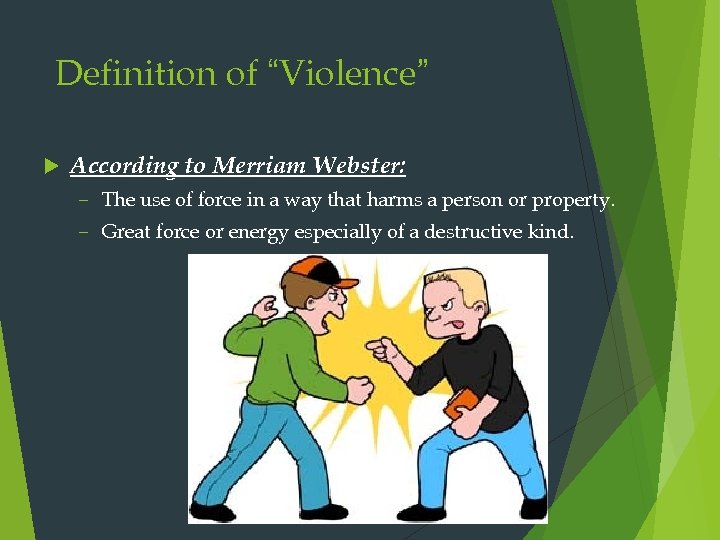 Definition of “Violence” According to Merriam Webster: – The use of force in a way that harms a person or property. – Great force or energy especially of a destructive kind.