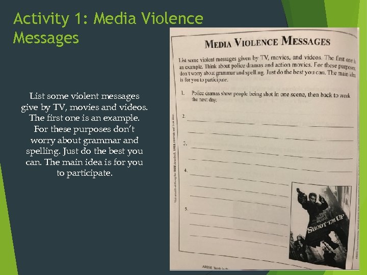 Activity 1: Media Violence Messages List some violent messages give by TV, movies and videos. The first one is an example. For these purposes don’t worry about grammar and spelling. Just do the best you can. The main idea is for you to participate.