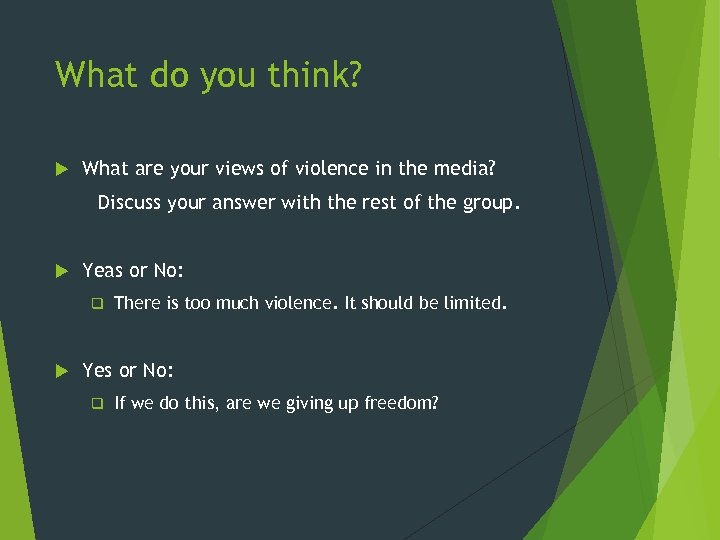 What do you think? What are your views of violence in the media? Discuss your answer with the rest of the group. Yeas or No: q There is too much violence. It should be limited. Yes or No: q If we do this, are we giving up freedom?