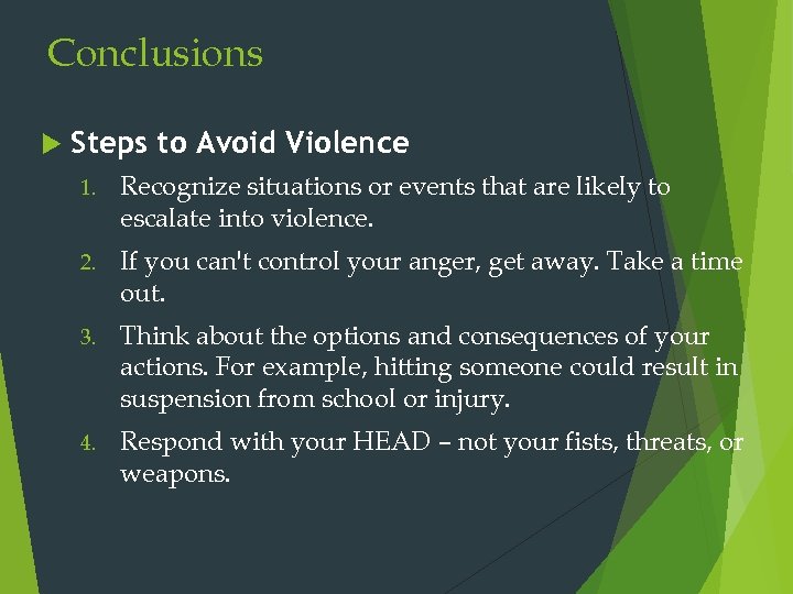 Conclusions Steps to Avoid Violence 1. Recognize situations or events that are likely to escalate into violence. 2. If you can't control your anger, get away. Take a time out. 3. Think about the options and consequences of your actions. For example, hitting someone could result in suspension from school or injury. 4. Respond with your HEAD – not your fists, threats, or weapons.