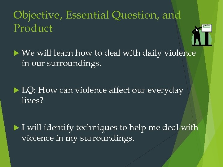 Objective, Essential Question, and Product We will learn how to deal with daily violence in our surroundings. EQ: How can violence affect our everyday lives? I will identify techniques to help me deal with violence in my surroundings.