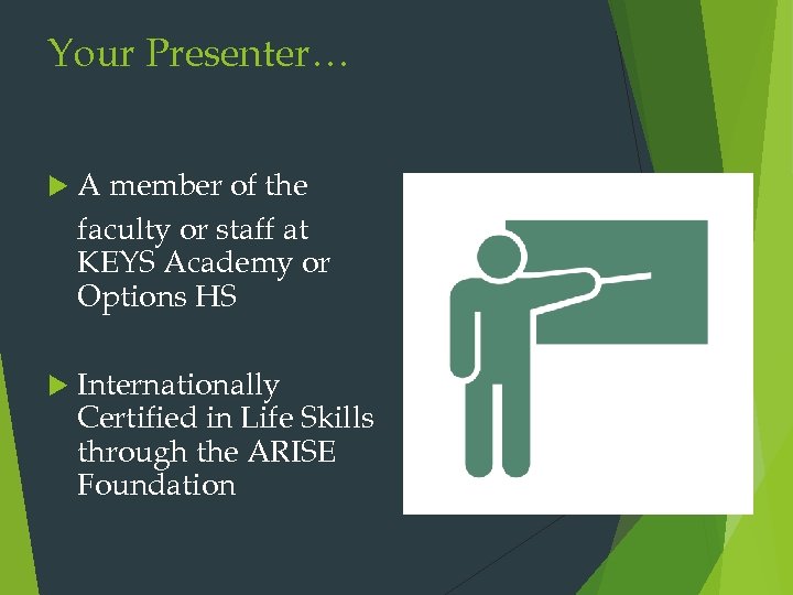 Your Presenter… A member of the faculty or staff at KEYS Academy or Options HS Internationally Certified in Life Skills through the ARISE Foundation