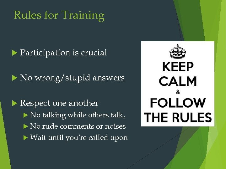 Rules for Training Participation is crucial No wrong/stupid answers Respect one another No talking while others talk, No rude comments or noises Wait until you’re called upon