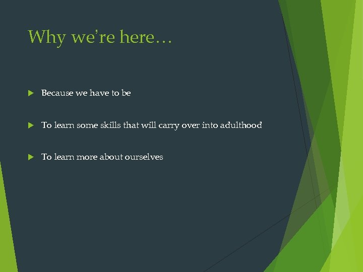 Why we’re here… Because we have to be To learn some skills that will carry over into adulthood To learn more about ourselves