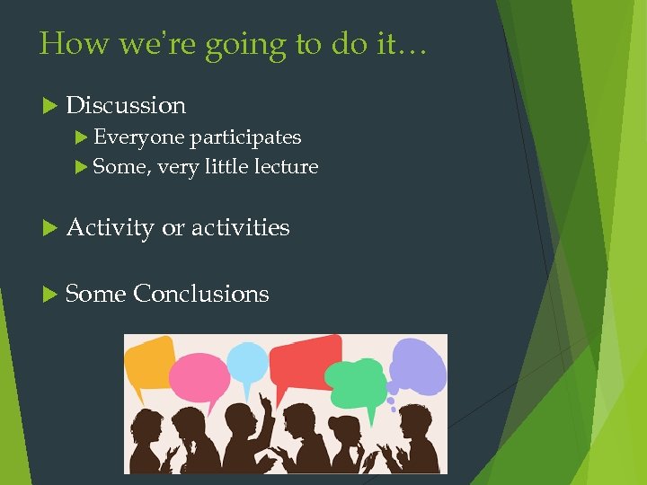 How we’re going to do it… Discussion Everyone participates Some, very little lecture Activity or activities Some Conclusions