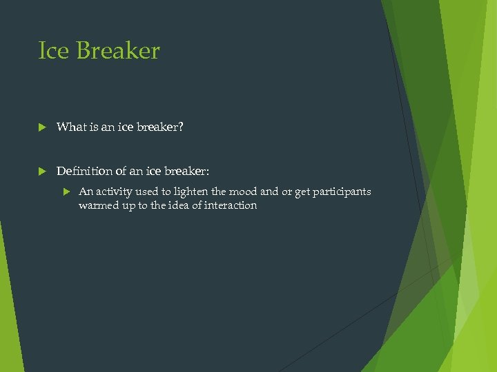Ice Breaker What is an ice breaker? Definition of an ice breaker: An activity used to lighten the mood and or get participants warmed up to the idea of interaction