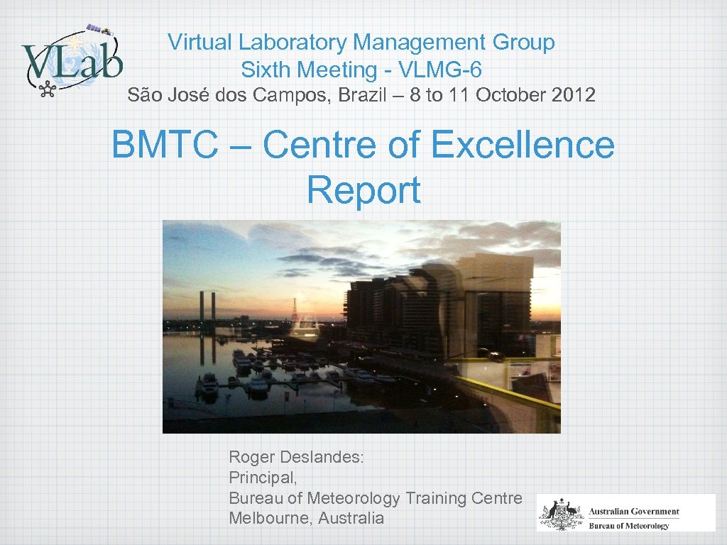 Virtual Laboratory Management Group Sixth Meeting - VLMG-6 São José dos Campos, Brazil – 8 to 11 October 2012 BMTC – Centre of Excellence Report Roger Deslandes: Principal, Bureau of Meteorology Training Centre Melbourne, Australia