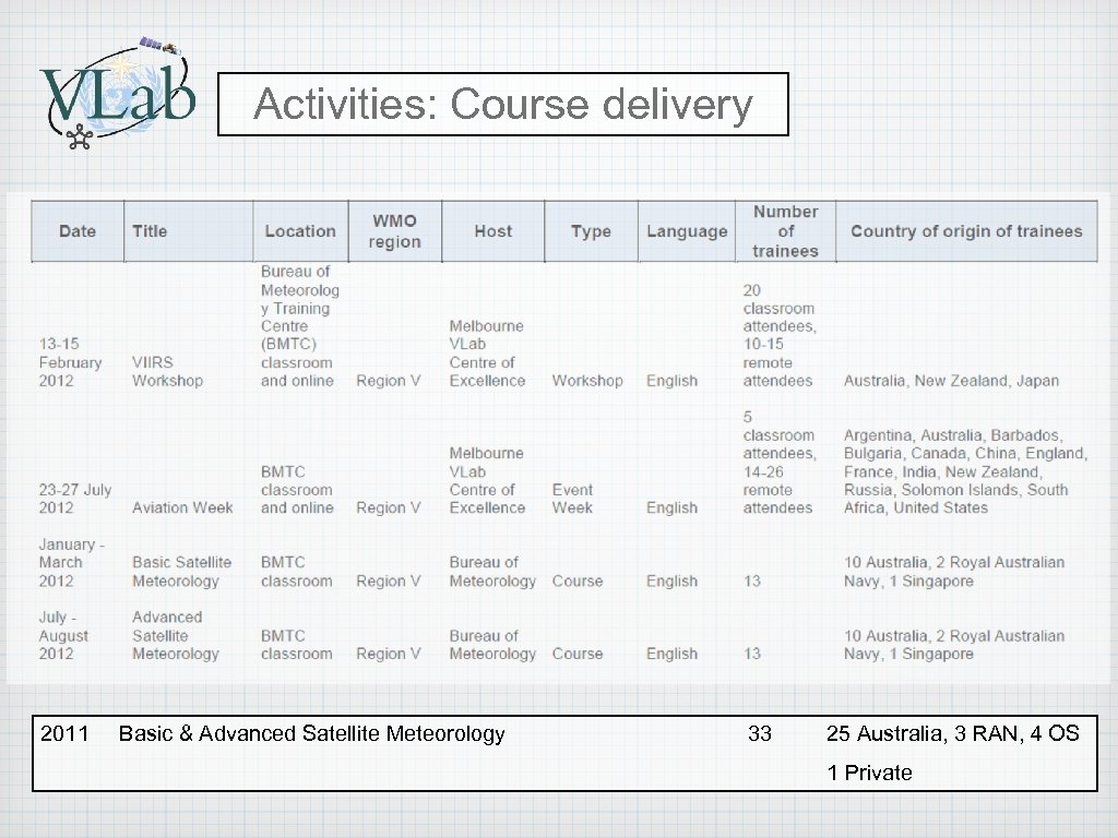 Activities: Course delivery 2011 Basic & Advanced Satellite Meteorology 33 25 Australia, 3 RAN, 4 OS 1 Private