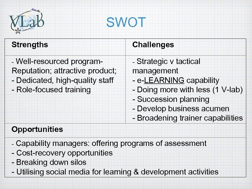 SWOT Strengths Challenges Well-resourced program. Reputation; attractive product; - Dedicated, high-quality staff - Role-focused training - - Strategic v tactical management - e-LEARNING capability - Doing more with less (1 V-lab) - Succession planning - Develop business acumen - Broadening trainer capabilities Opportunities Capability managers: offering programs of assessment - Cost-recovery opportunities - Breaking down silos - Utilising social media for learning & development activities -
