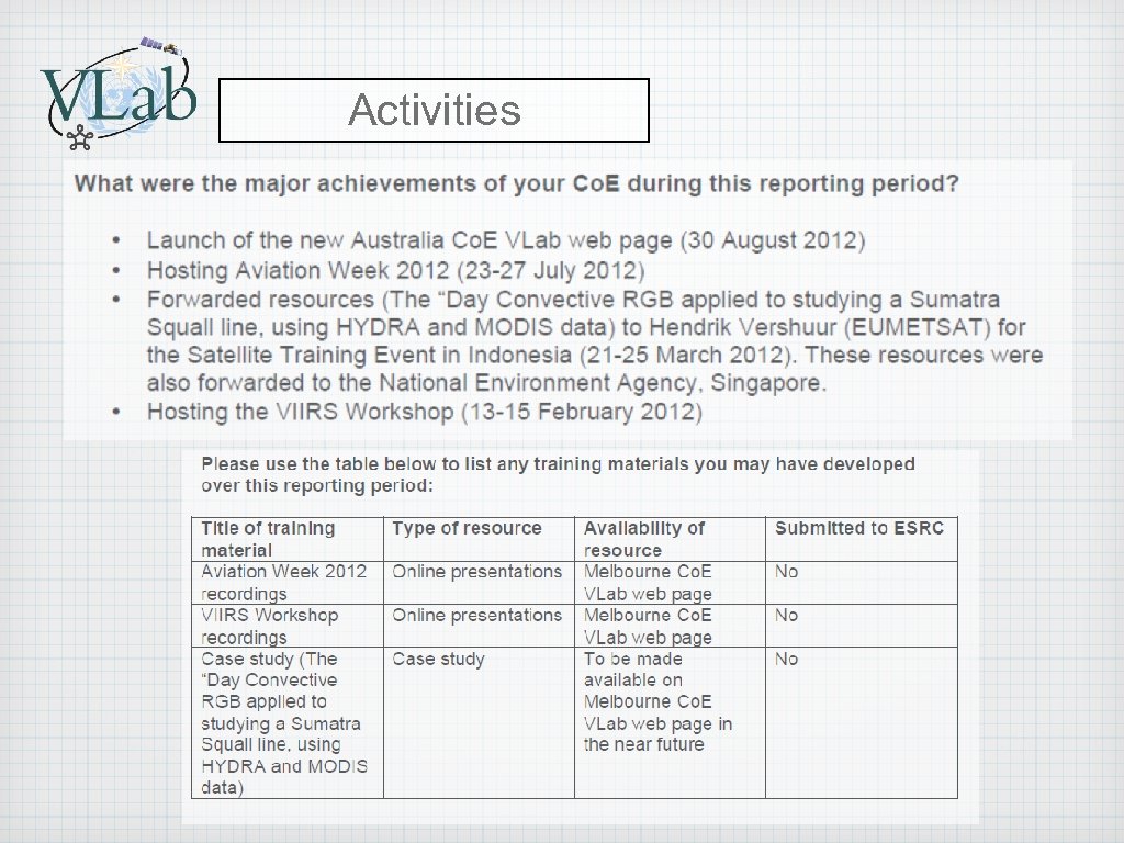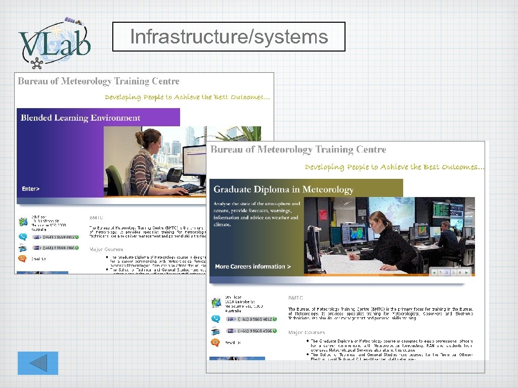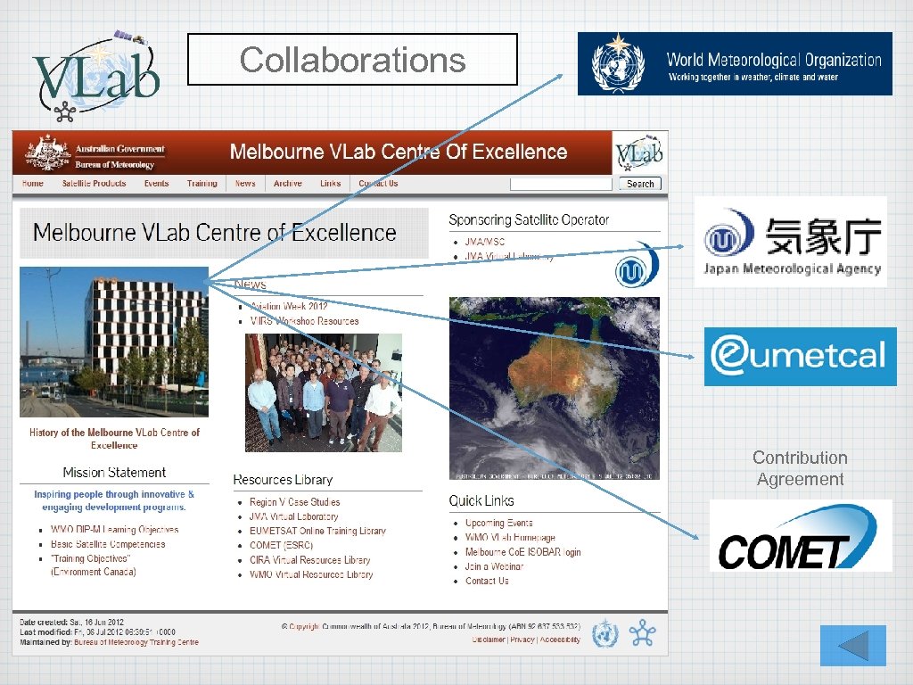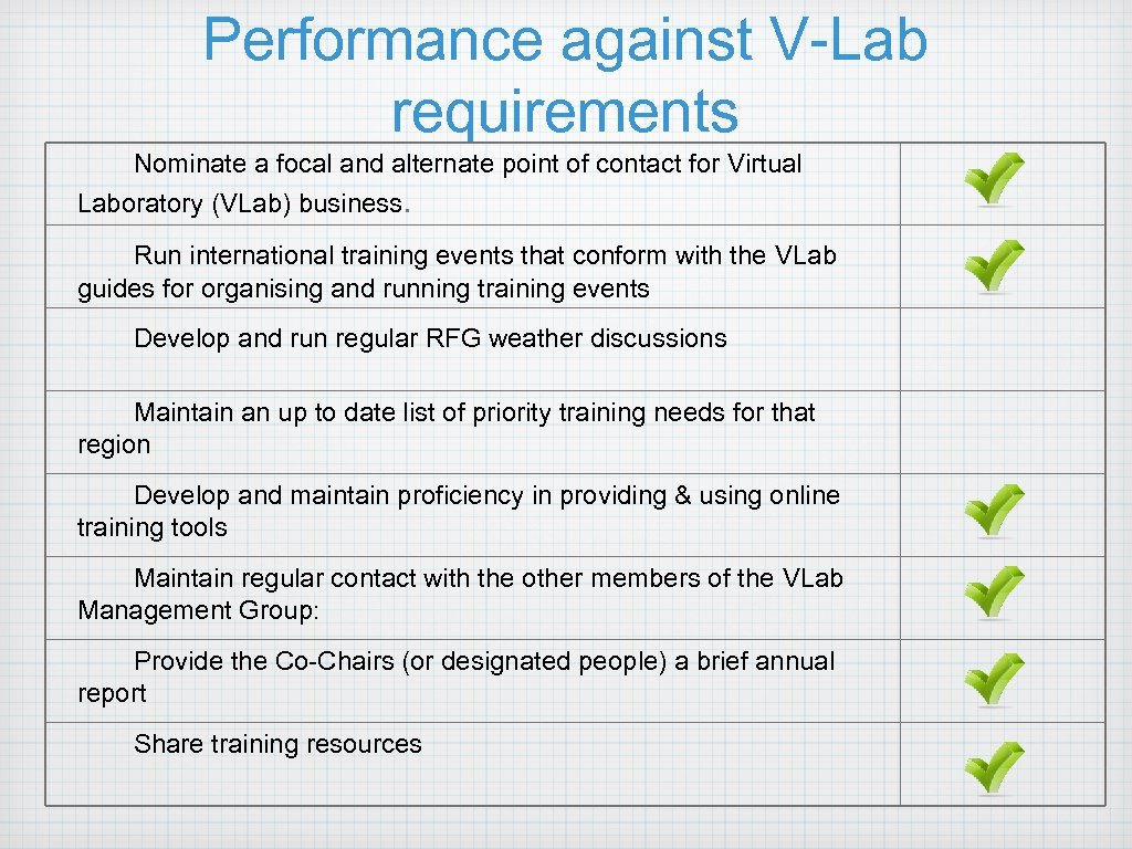 Performance against V-Lab requirements Nominate a focal and alternate point of contact for Virtual Laboratory (VLab) business. Run international training events that conform with the VLab guides for organising and running training events Develop and run regular RFG weather discussions Maintain an up to date list of priority training needs for that region Develop and maintain proficiency in providing & using online training tools Maintain regular contact with the other members of the VLab Management Group: Provide the Co-Chairs (or designated people) a brief annual report Share training resources