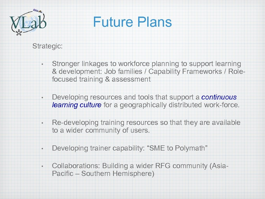 Future Plans Strategic: • Stronger linkages to workforce planning to support learning & development: Job families / Capability Frameworks / Rolefocused training & assessment • Developing resources and tools that support a continuous learning culture for a geographically distributed work-force. • Re-developing training resources so that they are available to a wider community of users. • Developing trainer capability: “SME to Polymath” • Collaborations: Building a wider RFG community (Asia. Pacific – Southern Hemisphere)