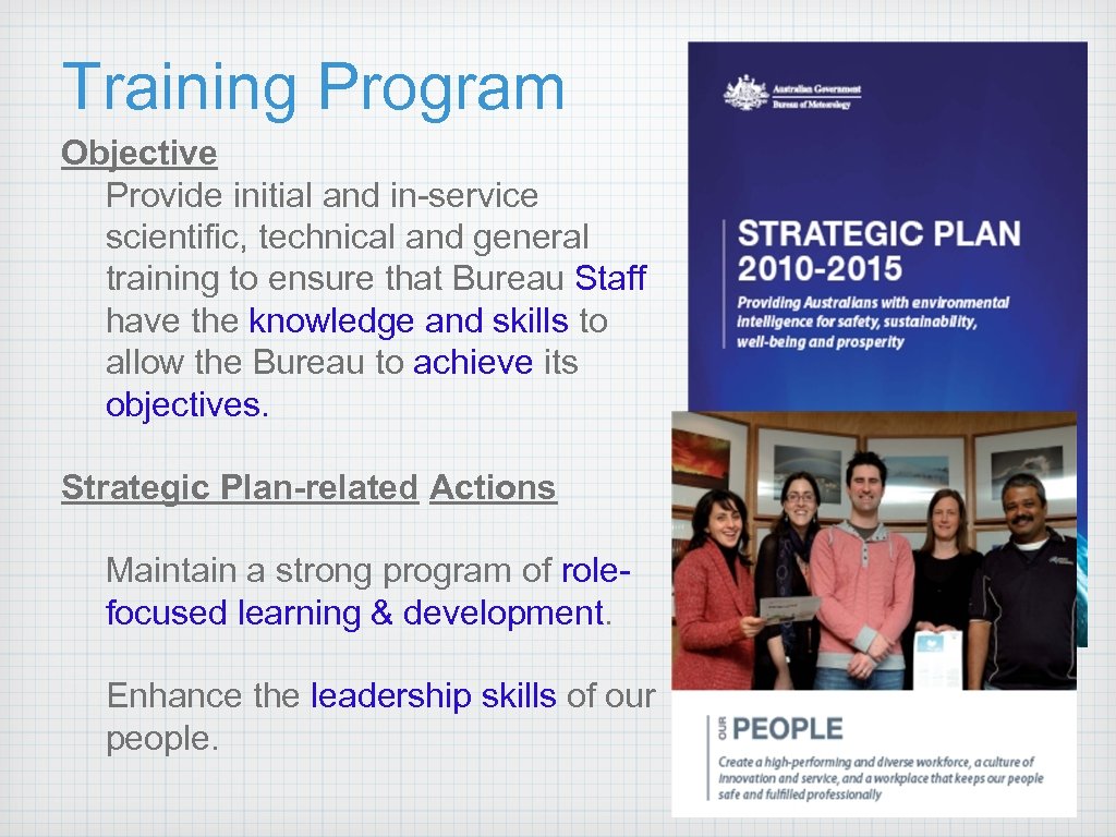 Training Program Objective Provide initial and in-service scientific, technical and general training to ensure that Bureau Staff have the knowledge and skills to allow the Bureau to achieve its objectives. Strategic Plan-related Actions Maintain a strong program of rolefocused learning & development. Enhance the leadership skills of our people.