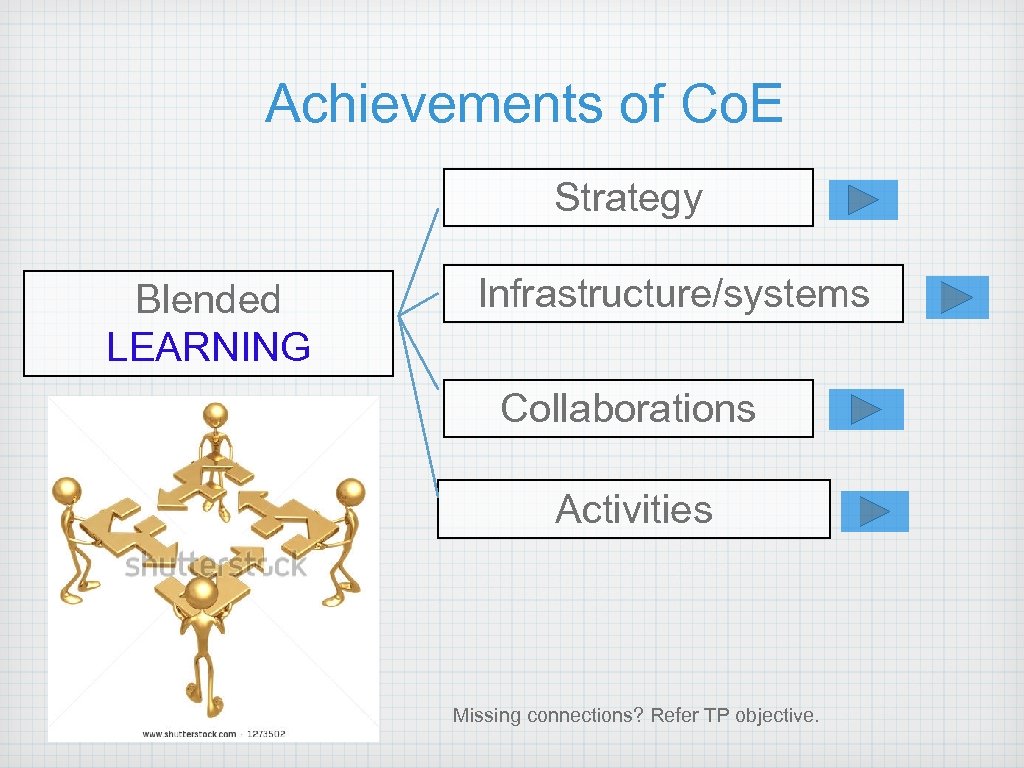 Achievements of Co. E Strategy Blended LEARNING Infrastructure/systems Collaborations Activities Missing connections? Refer TP objective.