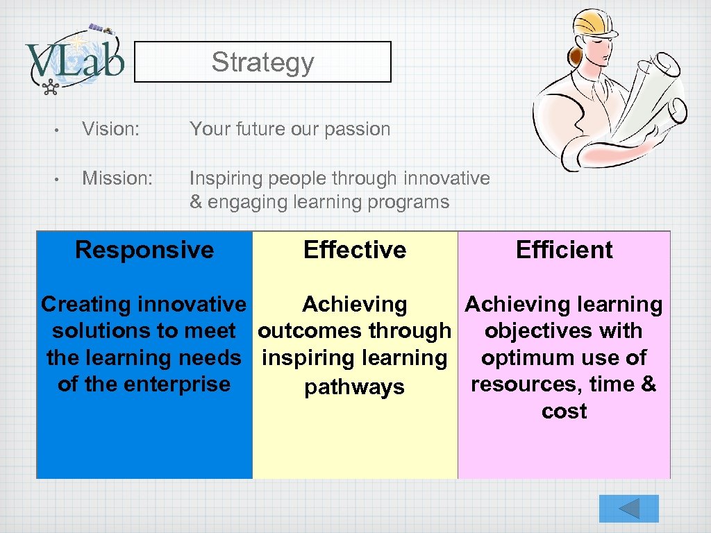 Strategy • Vision: Your future our passion • Mission: Inspiring people through innovative & engaging learning programs Responsive Effective Efficient Creating innovative Achieving learning solutions to meet outcomes through objectives with the learning needs inspiring learning optimum use of of the enterprise resources, time & pathways cost