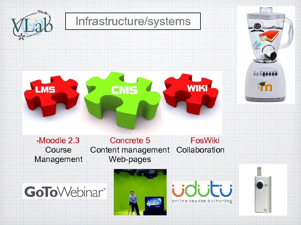 Infrastructure/systems Implementation of infrastructure to support “blended-learning” Concrete 5 Fos. Wiki 2. 3 Content management Collaboration Course Web-pages Management • Moodle