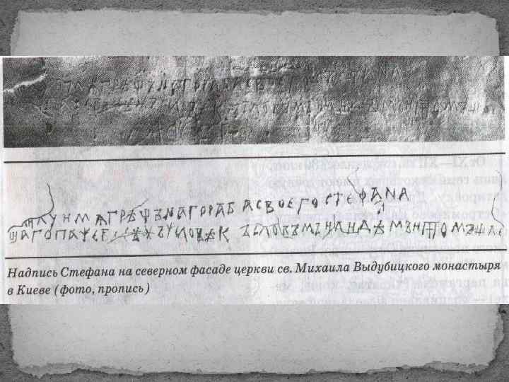 Свидетельством развития грамотности являются и сохранившиеся на стенах надписи – ГРАФФИТИ. Молодому Владимиру Мономаху принадлежит короткая надпись на стене Софийского собора в Киеве. Юный князь вывел: «Ох, тяжко мне!» – и подписался своим христианским именем: Василий. Записи-граффити на стене Софийского собора в Киеве о смерти «цесаря нашего» Ярослава Мудрого 20 февраля 1054 г.