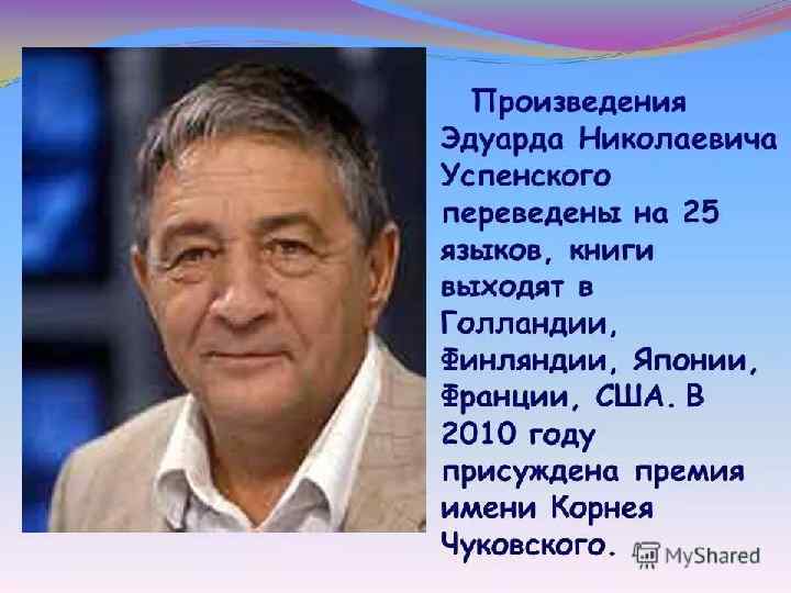 Эдуард Успенский написал для вас, ребята, сказки и сказочные повести, фантастические, детективные, приключенческие произведения, а также комиксы, стихи, пьесы, сценарии, он делает переводы и составляет сборники детского фольклора. Мы представляем вашему вниманию их: