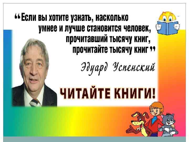 Дорогой читатель! В декабре отмечает день рождения знаменитый, великолепный, любимый детский писатель Эдуард Николаевич Успенский. Родился он 22 декабря 1937 года в городе Егорьевске Московской области. Интересно, что в школе Эдику всегда не хватало времени на уроки. И каждый понедельник он собирался взяться за ум. Но ему все время что-то мешало! И вот однажды мальчик неудачно спрыгнул с крыши и сломал себе ногу. Его привезли в больницу, и тут он внезапно понял, что не хочет оставаться невеждой. С этого времени Эдик стал хорошо учиться и после окончания школы поступил в авиационный институт. Но со временем Эдуард Успенский понял, что хочет стать писателем и начал писать юмористические рассказы. А чуть позже - детские книжки. Кстати, пришла к нему эта идея случайно. Однажды Эдуард Успенский устроился работать вожатым в пионерский лагерь. Там он читал своим воспитанникам книжки, а иногда и сам выдумывал захватывающие истории. Так появились первые произведения писателя. Сегодня мы предлагаем вам познакомиться с книгами автора, которые имеются в фонде Центральной детской библиотеки. Эти книги могут читать ребята всех возрастов и даже взрослые!