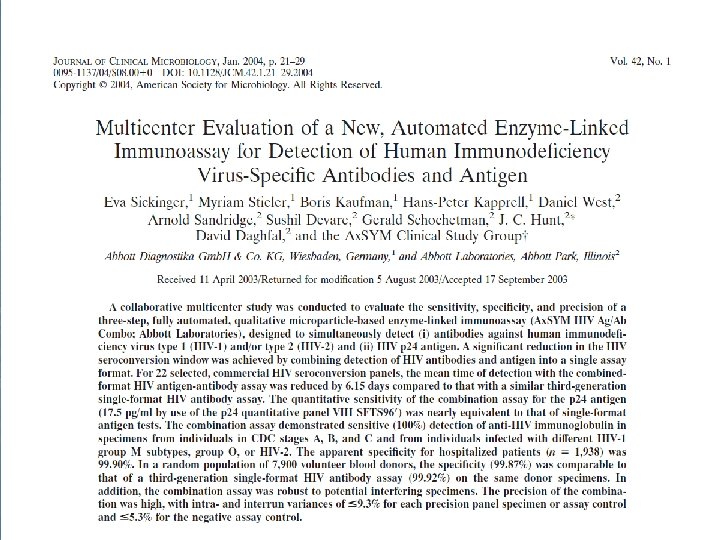 ELISA DE 4º GENERACIÓN Detectan tanto los anticuerpos generados contra el virus como así también las partículas virales (Ag p 24) que se puedan encontrar en la muestra. n Reducen el período de ventana, comprendido entre la aparición de ARN en el plasma y la detección de los anticuerpos, de 5, 4 – 22, 5 días (4 días antes de lo detectado por los ELISAS DE 3º GENERACIÓN). n