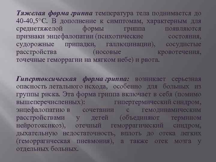 Тяжелая форма гриппа температура тела поднимается до 40 -40, 5°С. В дополнение к симптомам, характерным для среднетяжелой формы гриппа появляются признаки энцефалопатии (психотические состояния, судорожные припадки, галлюцинации), сосудистые расстройства (носовые кровотечения, точечные геморрагии на мягком небе) и рвота. Гипертоксическая форма гриппа: возникает серьезная опасность летального исхода, особенно для больных из группы риска. Эта форма гриппа включает в себя (помимо вышеперечисленных): гипертермический синдром, энцефалопатию в сочетании с гемодинамическим расстройствами у детей (объединяют термином нейротоксикоз), отечный геморрагический синдром, дыхательную недостаточность, вплоть до отека легких (геморрагическая пневмония), а также отек мозга у отдельных больных.