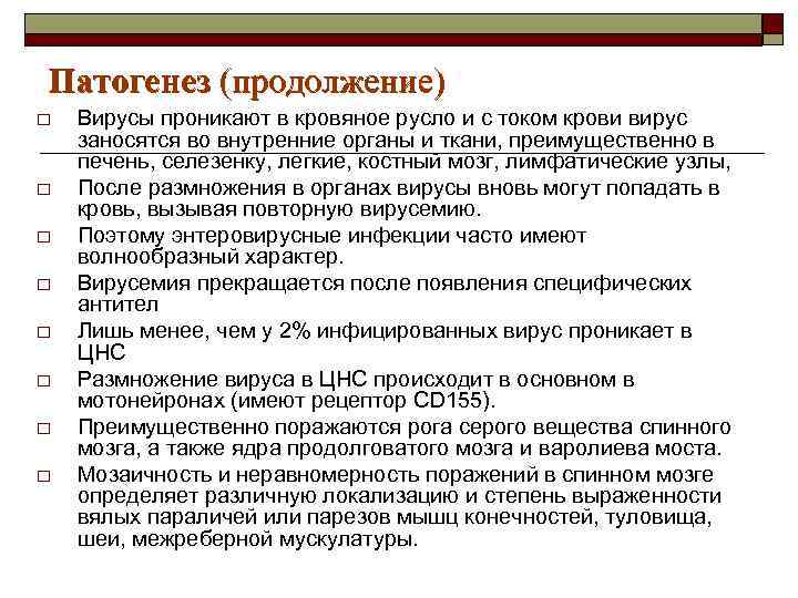 Патогенез (продолжение) o o o o Вирусы проникают в кровяное русло и с током крови вирус заносятся во внутренние органы и ткани, преимущественно в печень, селезенку, легкие, костный мозг, лимфатические узлы, После размножения в органах вирусы вновь могут попадать в кровь, вызывая повторную вирусемию. Поэтому энтеровирусные инфекции часто имеют волнообразный характер. Вирусемия прекращается после появления специфических антител Лишь менее, чем у 2% инфицированных вирус проникает в ЦНС Размножение вируса в ЦНС происходит в основном в мотонейронах (имеют рецептор СD 155). Преимущественно поражаются рога серого вещества спинного мозга, а также ядра продолговатого мозга и варолиева моста. Мозаичность и неравномерность поражений в спинном мозге определяет различную локализацию и степень выраженности вялых параличей или парезов мышц конечностей, туловища, шеи, межреберной мускулатуры.