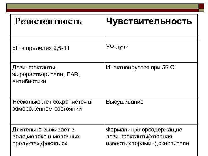 Резистентность Чувствительность p. H в пределах 2, 5 -11 УФ-лучи Дезинфектанты, жирорастворители, ПАВ, антибиотики Инактивируется при 56 С Несколько лет сохраняется в замороженном состоянии Высушивание Длительно выживает в воде, молоке и молочных продуктах, фекалиях Формалин, хлорсодержащие дезинфектанты(хлорная известь, хлорамин), окислители