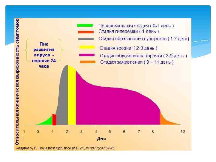 5. 6. Стадия образования корочки. С 4 по 9 день болячка подсыхает и покрывается коркой. При этом боль становится меньше, но появляется сильный зуд. Болячка может отваливаться частями и кровоточить. Герпес начинает заживать изнутри, болячка становится меньше. Стадия заживления. На 9 -11 день происходит затягивание раны и заживление. Тем не менее покраснение может сохраняться еще дня два. В этот период вирус возвращается в дремлющее состояние, в котором может находиться, пока не будет снова активизирован под воздействием факторов риска.
