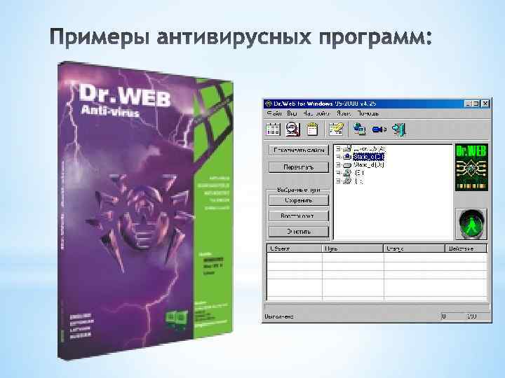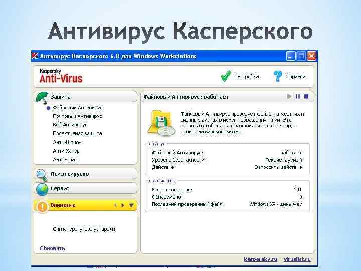 Антивирусные программы Условно-бесплатные: § § § ! AVP = Antiviral Toolkit Pro (www. avp. ru) – Е. Касперский Dr. Web (www. drweb. com) – И. Данилов Norton Antivirus (www. symantec. com) Mc. Afee (www. mcafee. ru) NOD 32 (www. eset. com) Есть бесплатные пробные версии! Бесплатные: § Avast Home (www. avast. com) § Antivir Personal (free-av. com) § AVG Free (free. grisoft. com)