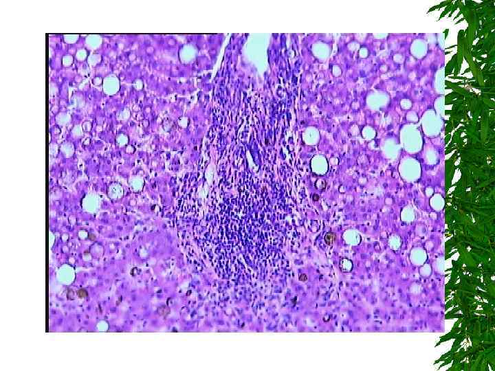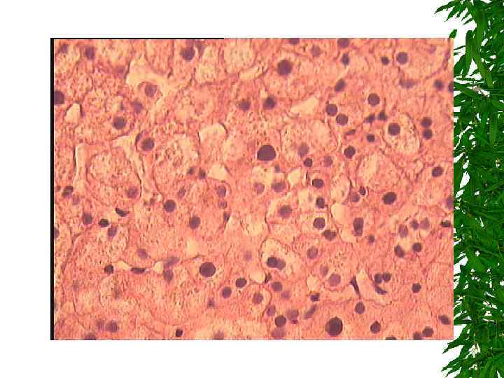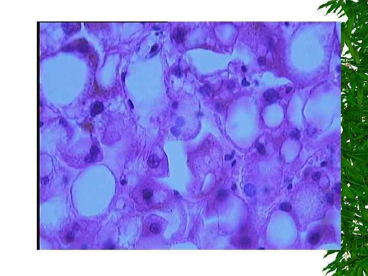 Алкогольное поражение печени. Жировая дистрофия гепатоцитов, вплоть до некроза.