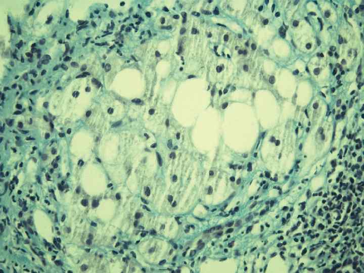 Алкогольный гепатит. Жировая дистрофия гепатоцитов. Наличие телец Маллори.