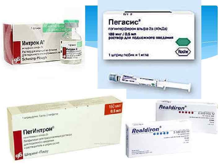 - Пэгинтерферон альфа-2 а (ПЕГАСИС) доза 180 мкг, подкожно 1 раз в неделю. Продолжительность лечения – 1 год. - Ламивудин назначают по 100 мг/сут перорально. Продолжительность курса лечения – 1 год. Хронический вирусный гепатит С: Обычно проводят комбинированную терапию: - пэгинтерферон альфа-2 а по 180 мкг/кг подкожно 1 раз в неделю с рибавирином или пэгинтерферон альфа-2 b по 1, 5 мкг/кг подкожно 1 раз в неделю с рибавирином, дозтровка которого зависит от массы тела. Монотерапию пэгинтерфероном альфа-2 а или альфа-2 b проводят при наличии противопоказаний к приёму рибавирина.