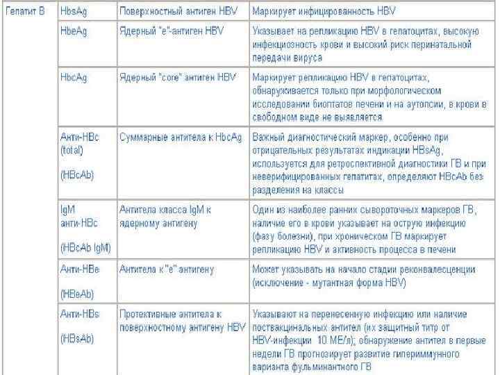 Анти-HBc (АТ к ядерному Аг) – важный диагностический маркёр инфицирования. Анти-HBc Ig. M – один из наиболее ранних сывороточных маркёров ХВГВ и чувствительный маркёр HBVинфекции. Указывает на репликацию вируса и активность процесса в печени; его исчезновение служит показателем либо санации организма от возбудителя, либо развития интегративной фазы HBVинфекции. Анти-HBc Ig. G сохраняются многие годы; свидетельствуют об имеющейся или ранее перенесенной инфекции. HBV-ДНК и ДНК-полимераза – диагностические маркёры репликации вируса.