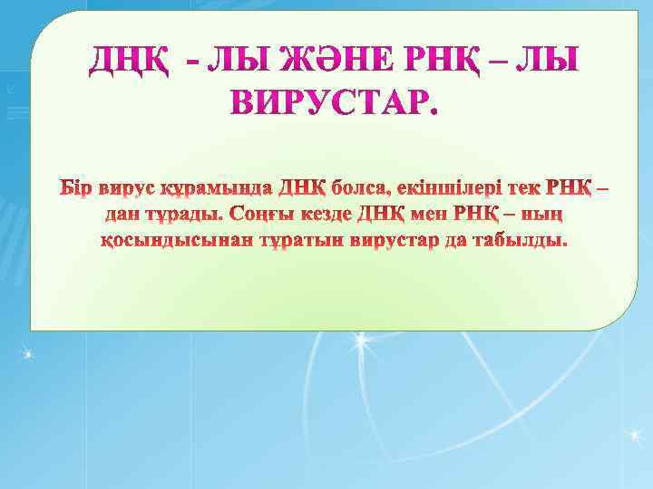 Вирустардың генетикалық аппаратының ерекшелігі ДНҚ – лы және РНҚ – лы вирустар Орындаған: Әбсәмет Ж. Т. Қабылдаған: Сманова Г. Б