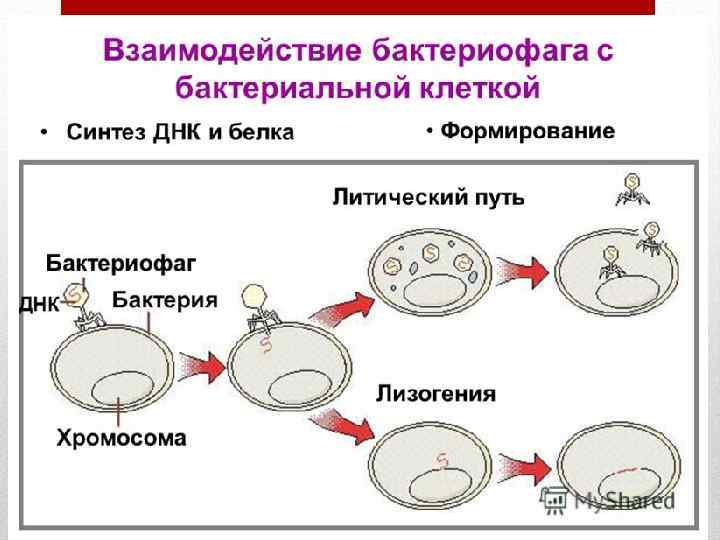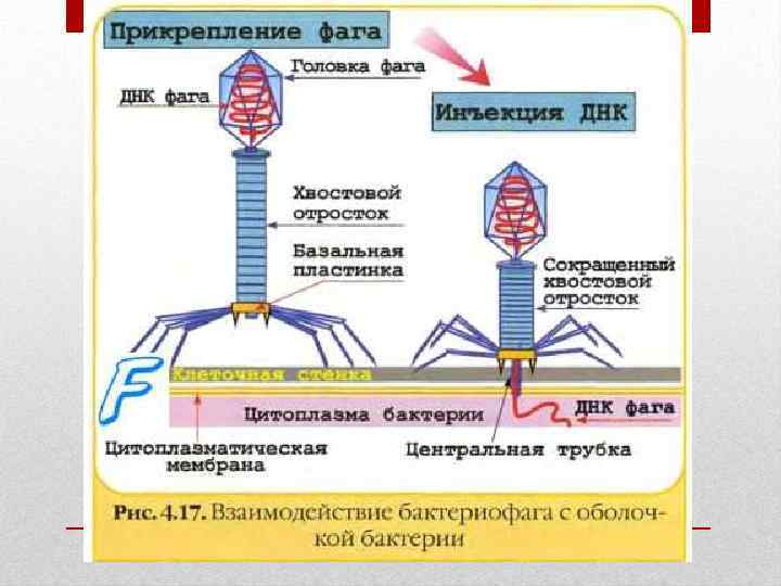 Взаимодействие бактериофага с бактериальной клеткой • БФ адсорбируется на специальных, специфических для конкретного фага, рецепторах клеточной стенки чувствительной бактериальной клетки. • Следующая стадия – проникновение нуклеиновой кислоты БФ внутрь бактериальной клетки (депротеинизация). • В дальнейшем происходит взаимодействие БФ с геномом пораженной клетки.