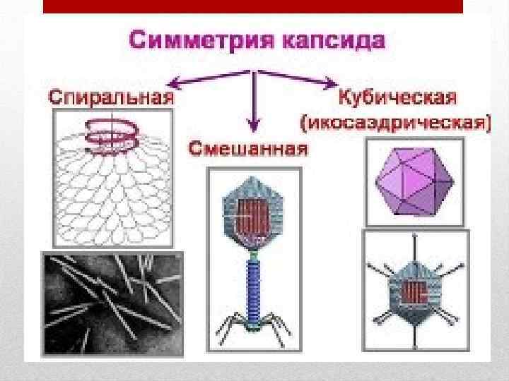 При спиральной симметрии белковые субъединицы располагаются по спирали, а между ними, также по спирали, уложена геномная нуклеиновая кислота. При кубическом типе симметрии вирионы могут быть в виде многогранников, чаще всего- двадцатигранники — икосаэдры.