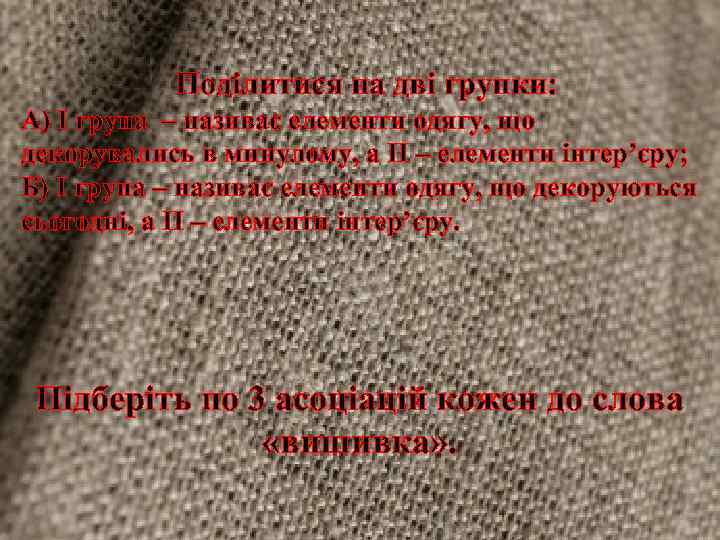 Поділитися на дві групки: А) І група – називає елементи одягу, що декорувались в минулому, а ІІ – елементи інтер’єру; Б) І група – називає елементи одягу, що декоруються сьогодні, а ІІ – елементи інтер’єру. Підберіть по 3 асоціацій кожен до слова «вишивка» .