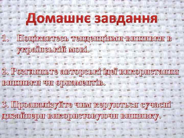 Домашнє завдання 1. Поцікавтесь тенденціями вишивки в українській мові. 2. Розгляньте авторські ідеї використання вишивки чи орнаментів. 3. Проаналізуйте чим керуються сучасні дизайнери використовуючи вишивку.