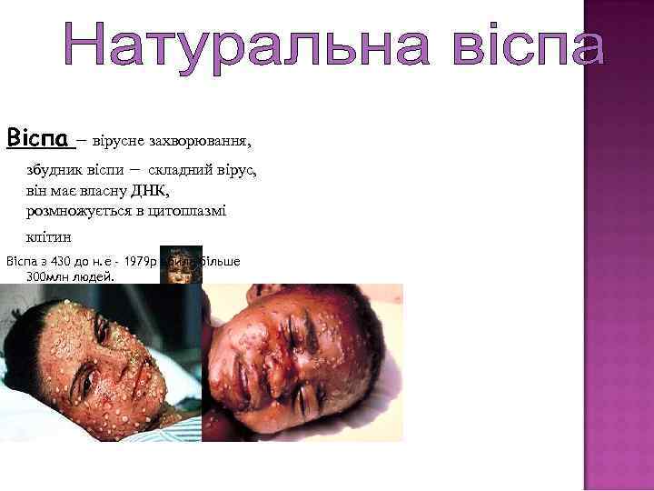 Віспа — вірусне захворювання, збудник віспи — складний вірус, він має власну ДНК, розмножується в цитоплазмі клітин Віспа з 430 до н. е - 1979 р вбила більше 300 млн людей.