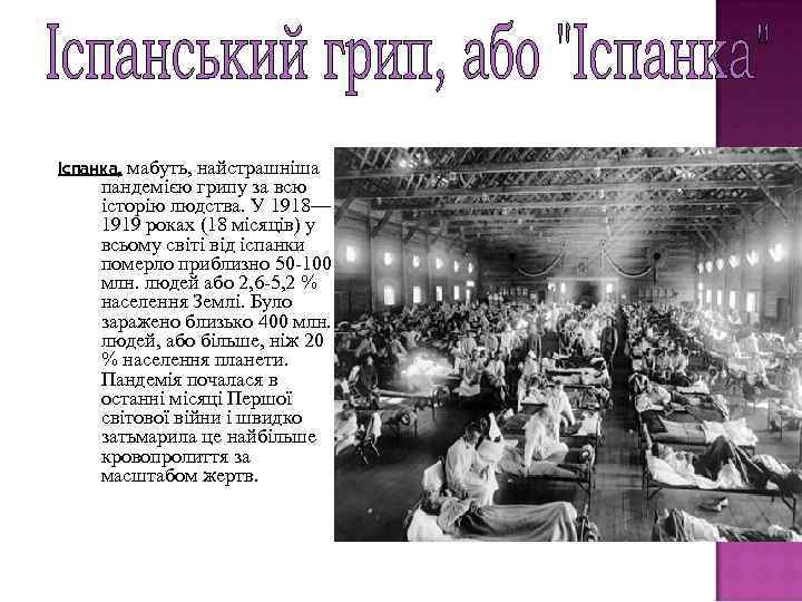 мабуть, найстрашніша пандемією грипу за всю історію людства. У 1918— 1919 роках (18 місяців) у всьому світі від іспанки померло приблизно 50 -100 млн. людей або 2, 6 -5, 2 % населення Землі. Було заражено близько 400 млн. людей, або більше, ніж 20 % населення планети. Пандемія почалася в останні місяці Першої світової війни і швидко затьмарила це найбільше кровопролиття за масштабом жертв. Іспанка,