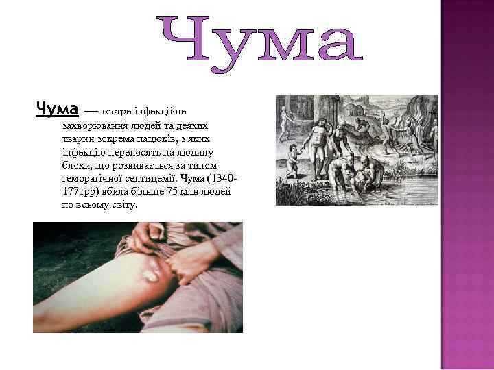 Чума — гостре інфекційне захворювання людей та деяких тварин зокрема пацюків, з яких інфекцію переносять на людину блохи, що розвивається за типом геморагічної септицемії. Чума (13401771 рр) вбила більше 75 млн людей по всьому світу.