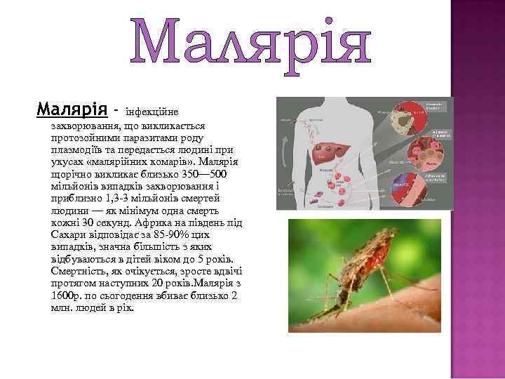 Малярія - інфекційне захворювання, що викликається протозойними паразитами роду плазмодіїв та передається людині при укусах «малярійних комарів» . Малярія щорічно викликає близько 350— 500 мільйонів випадків захворювання і приблизно 1, 3 -3 мільйонів смертей людини — як мінімум одна смерть кожні 30 секунд. Африка на південь під Сахари відповідає за 85 -90% цих випадків, значна більшість з яких відбуваються в дітей віком до 5 років. Смертність, як очікується, зросте вдвічі протягом наступних 20 років. Малярія з 1600 р. по сьогодення вбиває близько 2 млн. людей в рік.