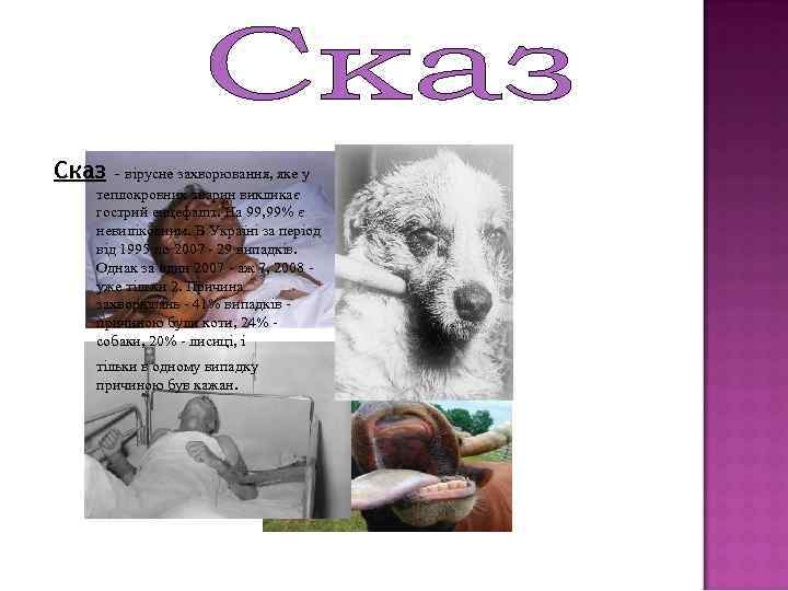 Сказ - вірусне захворювання, яке у теплокровних тварин викликає гострий енцефаліт. На 99, 99% є невиліковним. В Україні за період від 1995 по 2007 - 29 випадків. Однак за один 2007 - аж 7, 2008 уже тільки 2. Причина захворювань - 41% випадків причиною були коти, 24% собаки, 20% - лисиці, і тільки в одному випадку причиною був кажан.
